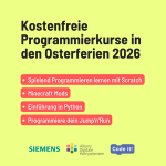 Unsere kostenlosen Programmierkurse für die Osterferien 2026 sind online: Ab sofort könnt ihr eure Kinder anmelden. Die Plätze sind begrenzt – sichert euch am besten gleich einen Platz.